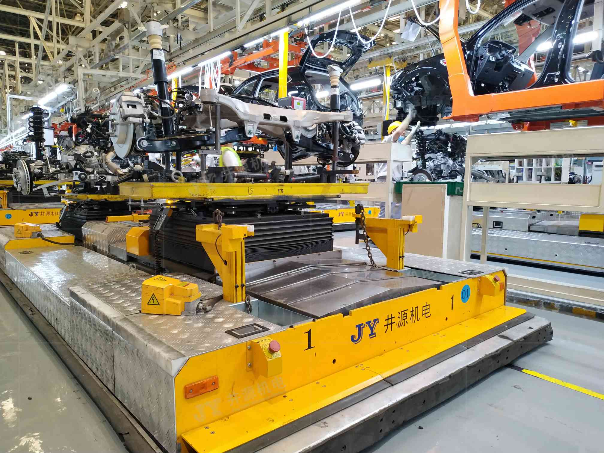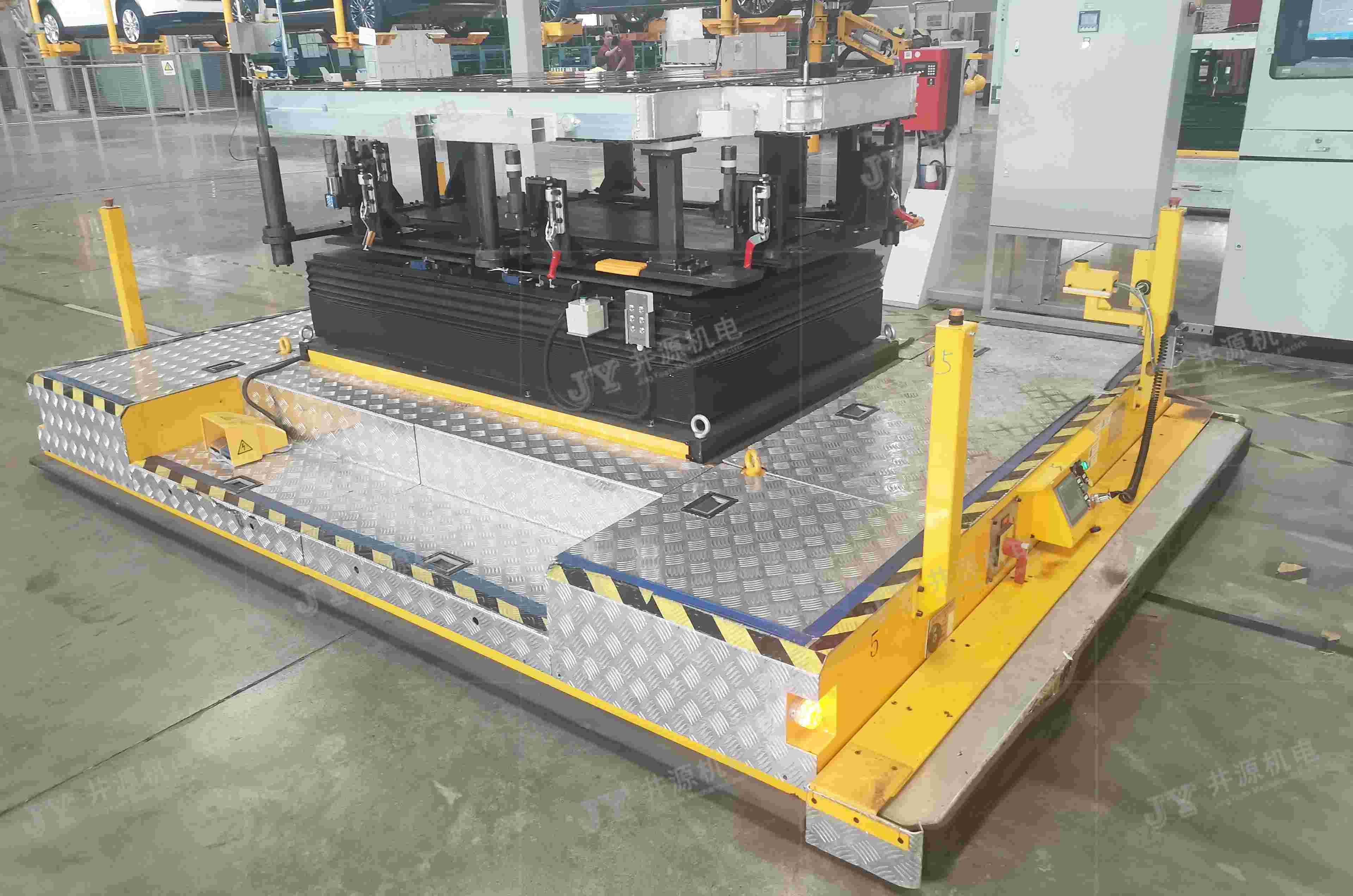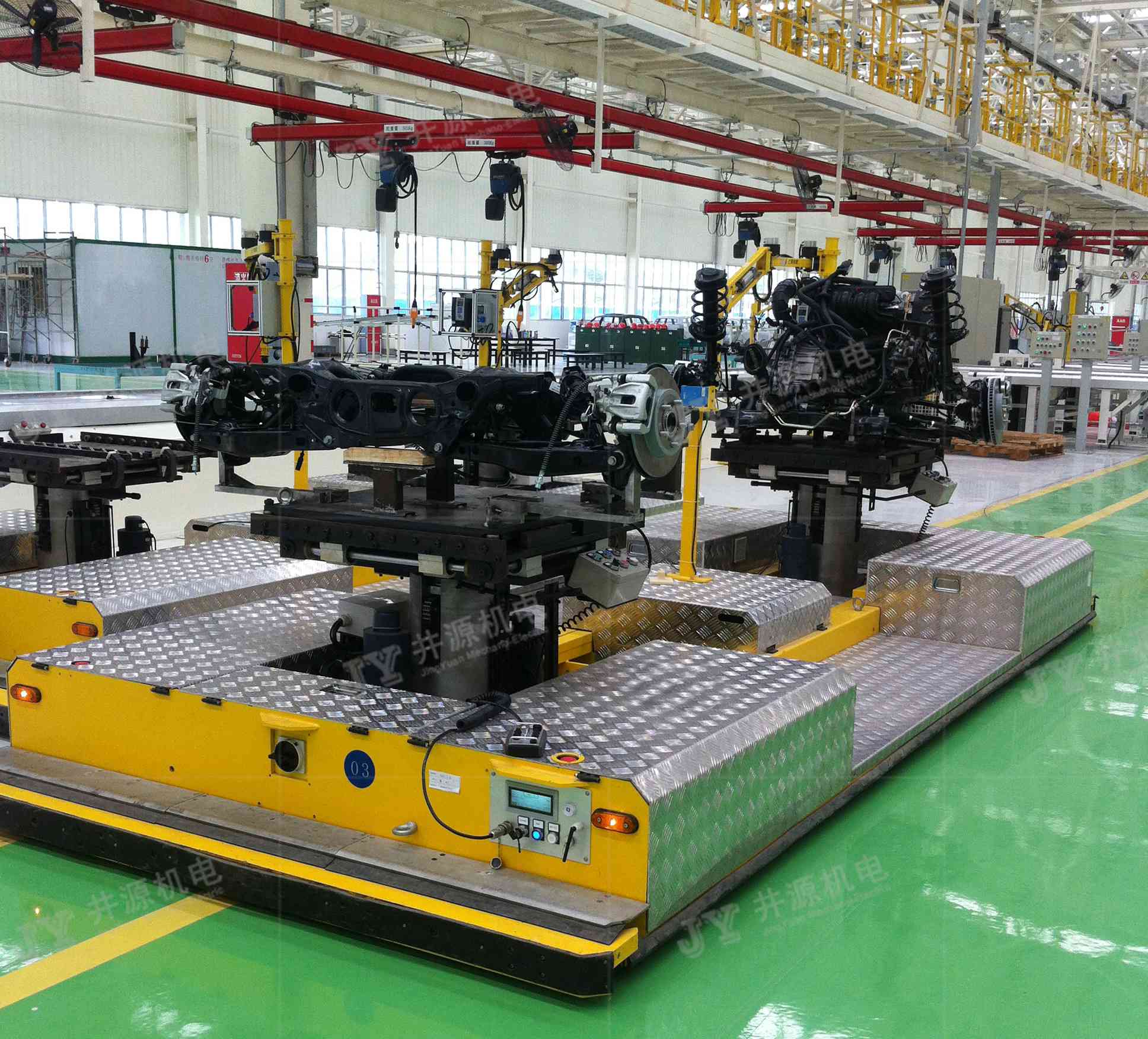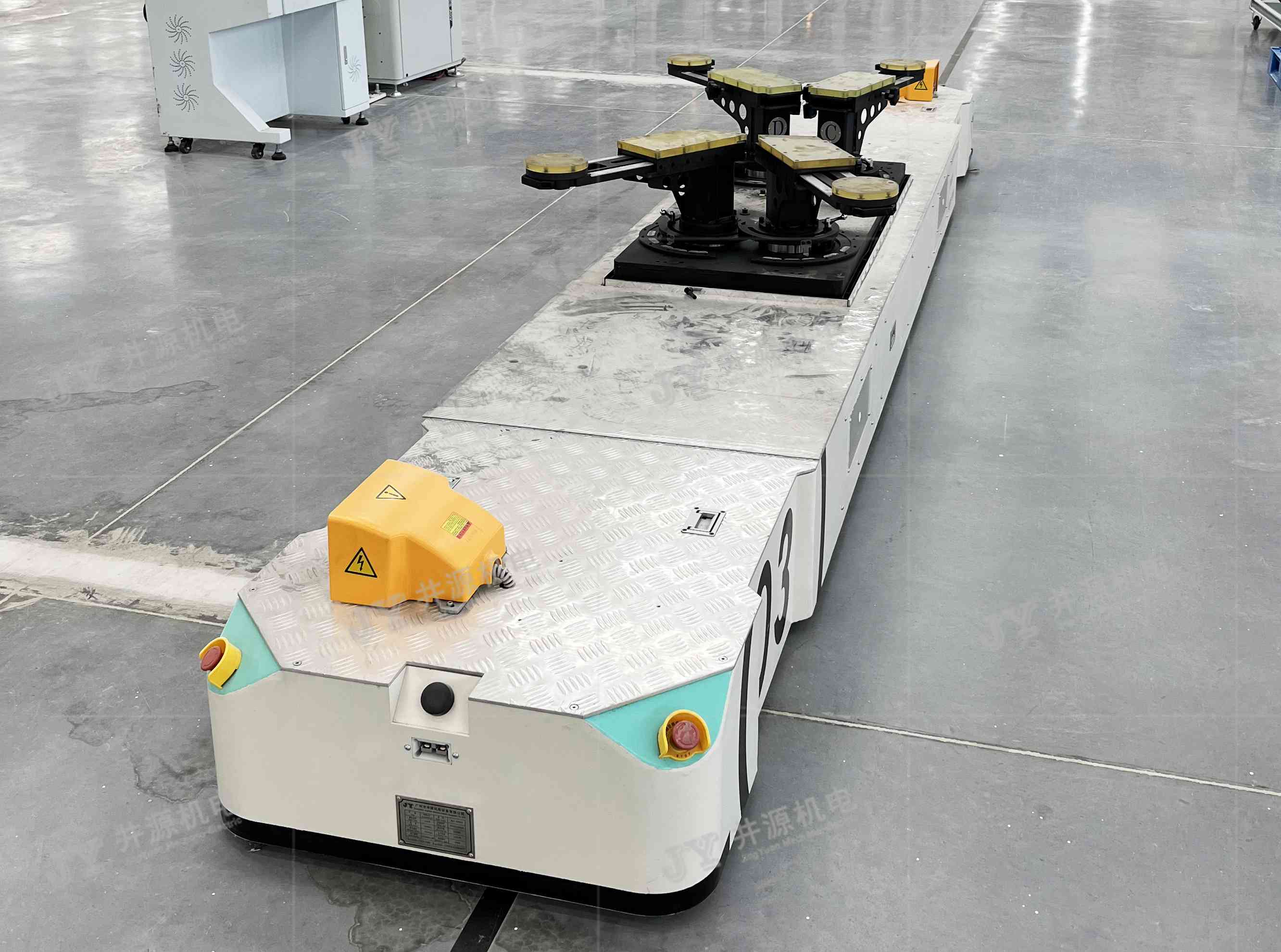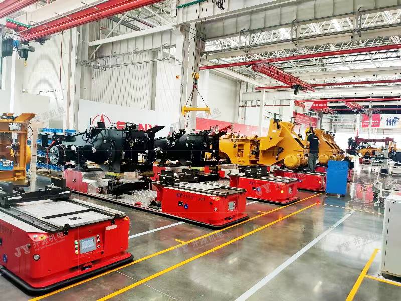 井源機(jī)電重載裝配型AGV負(fù)載30噸以下可定制,主要應(yīng)用于室內(nèi)工業(yè)物流搬運(yùn),主機(jī)工藝裝配及輔助裝配等場景。國內(nèi)某裝載機(jī)企業(yè),采用井源機(jī)電負(fù)載25噸重載裝配型AGV來完成裝載機(jī)裝配線的裝配工作,打造重工行業(yè)柔性化生產(chǎn)線,實(shí)現(xiàn)生產(chǎn)智能化識(shí)別、輸送、管理、信息交互等特點(diǎn),降低勞動(dòng)強(qiáng)度,大幅提高生產(chǎn)效率及生產(chǎn)質(zhì)量。