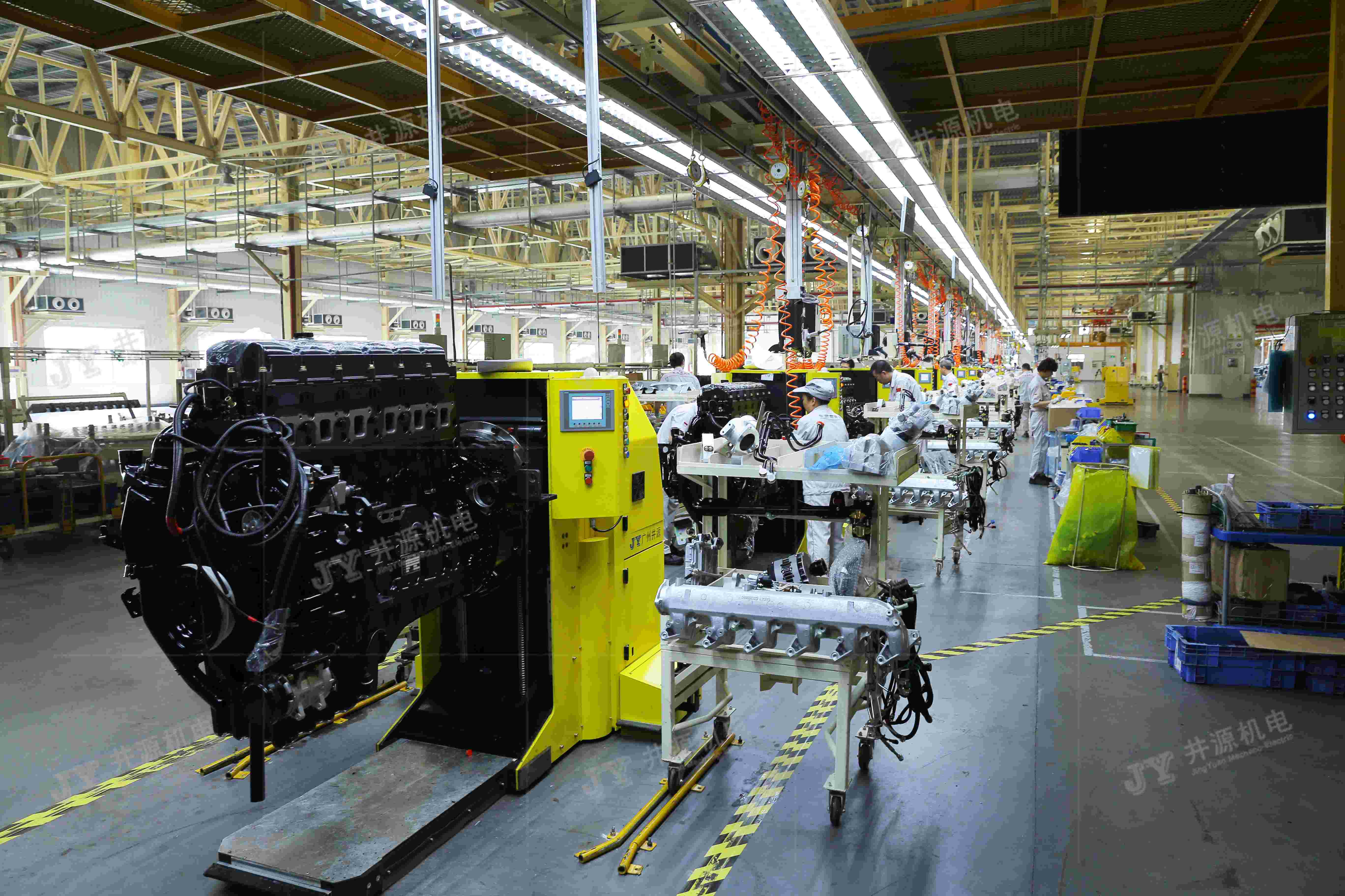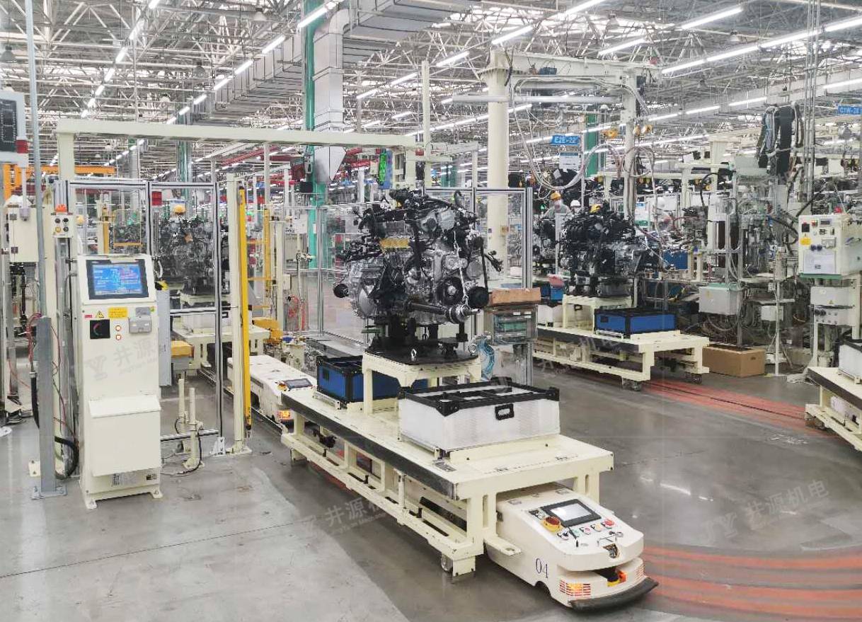在發(fā)動(dòng)機(jī)裝配生產(chǎn)線上,井源機(jī)電柔性裝配型AGV能滿足多機(jī)型混線生產(chǎn),同時(shí)裝配型AGV能根據(jù)作業(yè)人員的身高,自動(dòng)調(diào)節(jié)發(fā)動(dòng)機(jī)到最佳裝配姿態(tài),從而降低人工作業(yè)難度,提高生產(chǎn)效率。發(fā)動(dòng)機(jī)的自動(dòng)對接、搬運(yùn)、升降、旋轉(zhuǎn)、人工裝配等功能,是企業(yè)實(shí)現(xiàn)發(fā)動(dòng)機(jī)智能化、信息化、柔性化、人性化生產(chǎn)的重要管理方式。